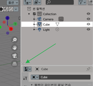 먼저 마우스를 아웃 라이너와 프로퍼티스 창의 경계에 갖다 대면, 어느 지점에서 위아래 화살표가 아닌 흰색 십자가 표시가 나올 겁니다.