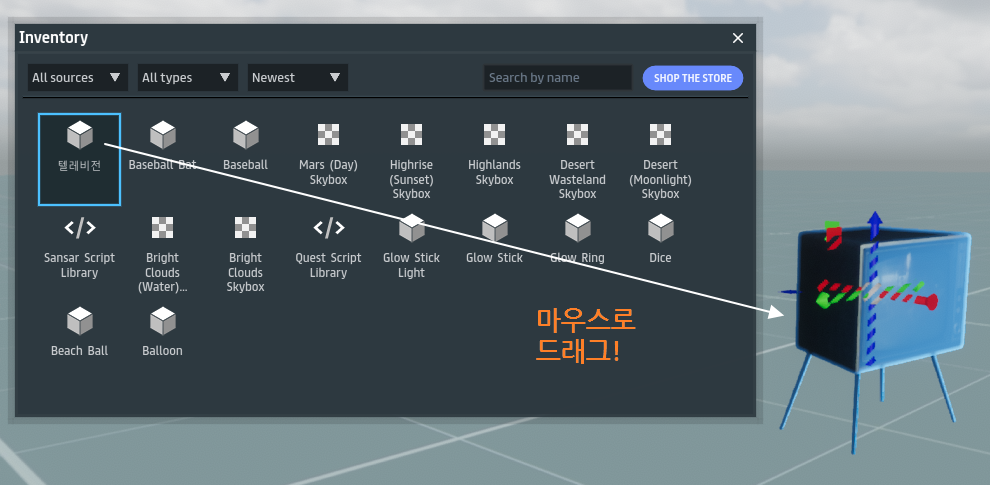 월드 에디터에서 먼저 tv 모델 파일을 업로드합니다.