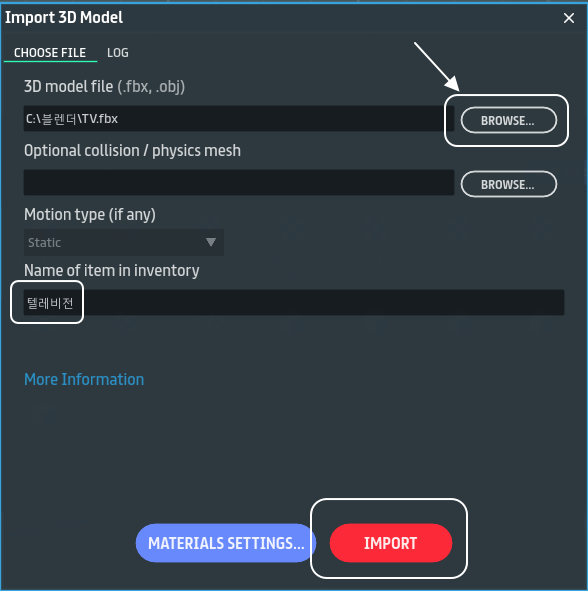 BROWSE 버튼을 눌러 금방 블렌더에서 export 한 fbx 파일을 선택합니다.