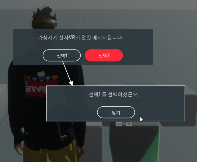 월드를 빌드하고 오브젝트를 터치하면 아래와 같이 팝업창 및 선택버튼이 뜨는건 지난번과 동일하나