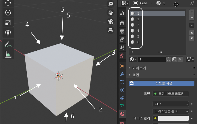 왼쪽의 materials 에서 1~6을 하나씩 선택하시면서