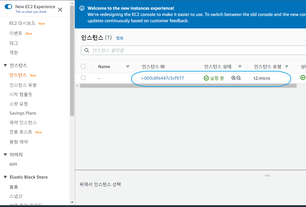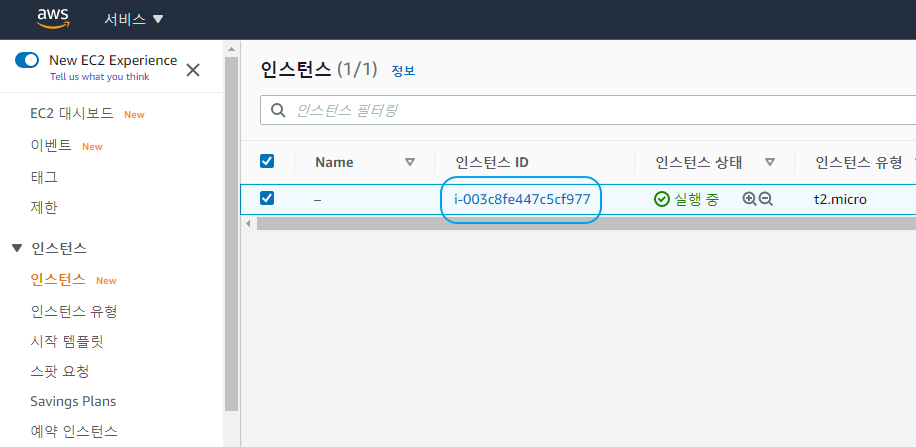 인스턴스 목록 창으로 돌아옵니다. 여기서 해당 인스턴스 아이디를 클릭하면,
