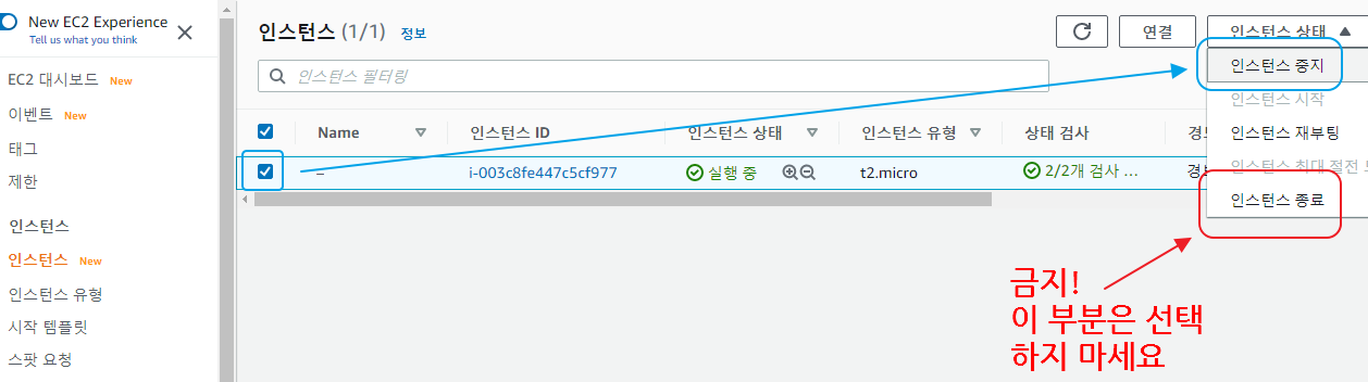 절대로 인스턴스 종료를 선택하시면 안됩니다.
