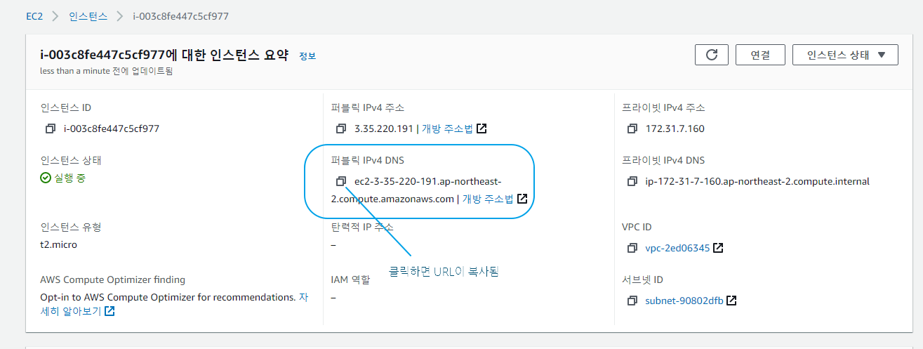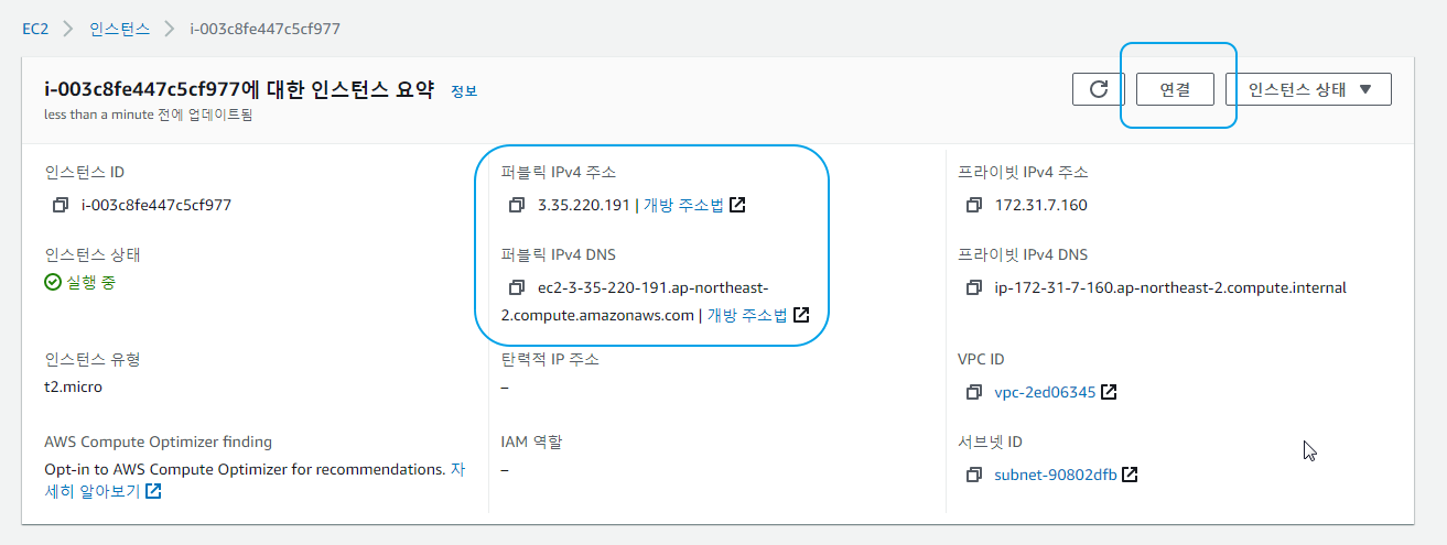 퍼블릭ipv4 주소와, 퍼블릭 ipv4 DNS 가 나옵니다.