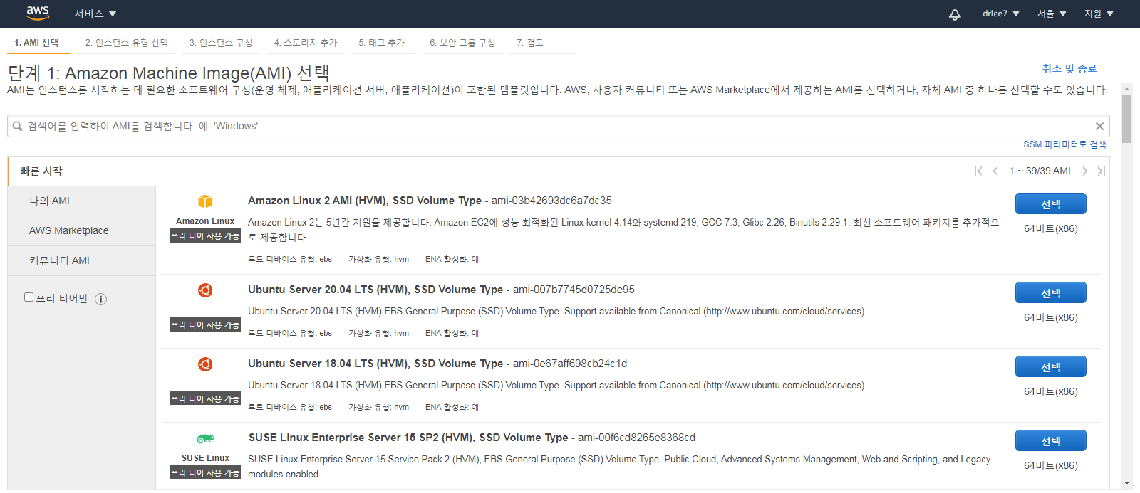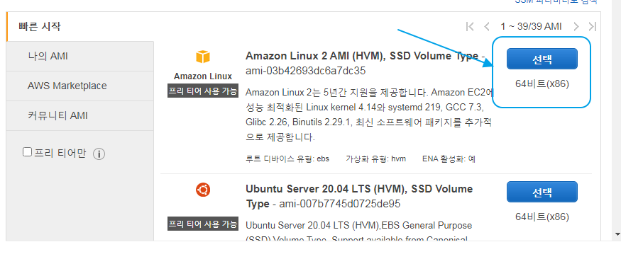 그 다음으로는 아마존 머신 이미지 선택이 나옵니다.