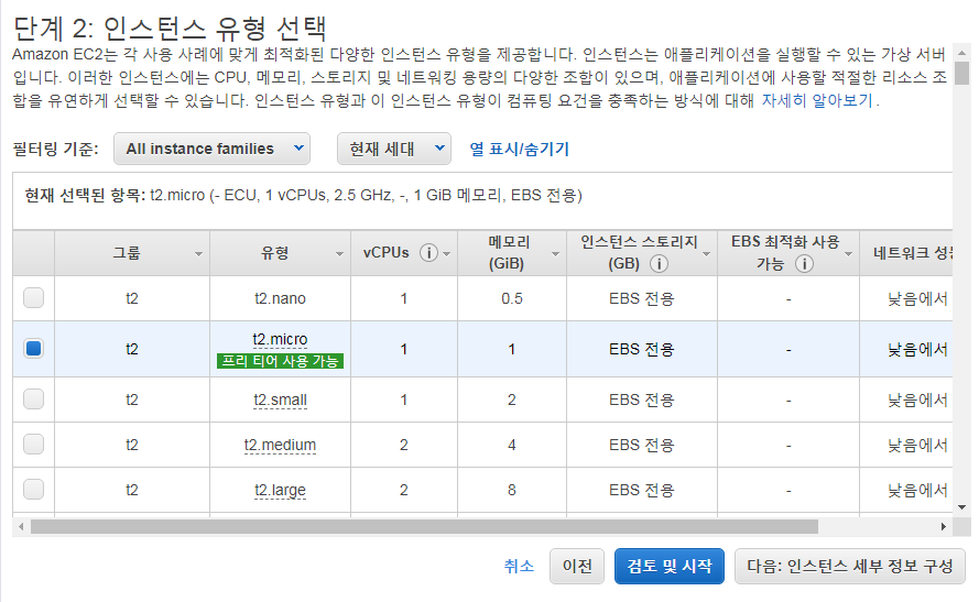 그러면 아래와 같이 인스턴스 유형 목록이 나오는데요. 뭐 선택할 다른게 없습니다.