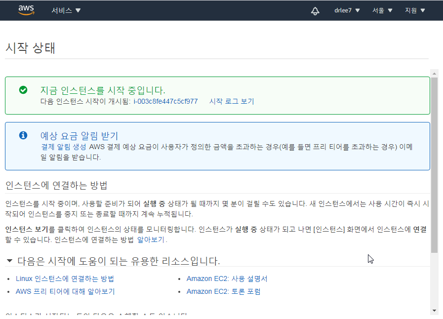 아래와 같이 인스턴스가 시작되었다는 메시지가 나왔습니다.