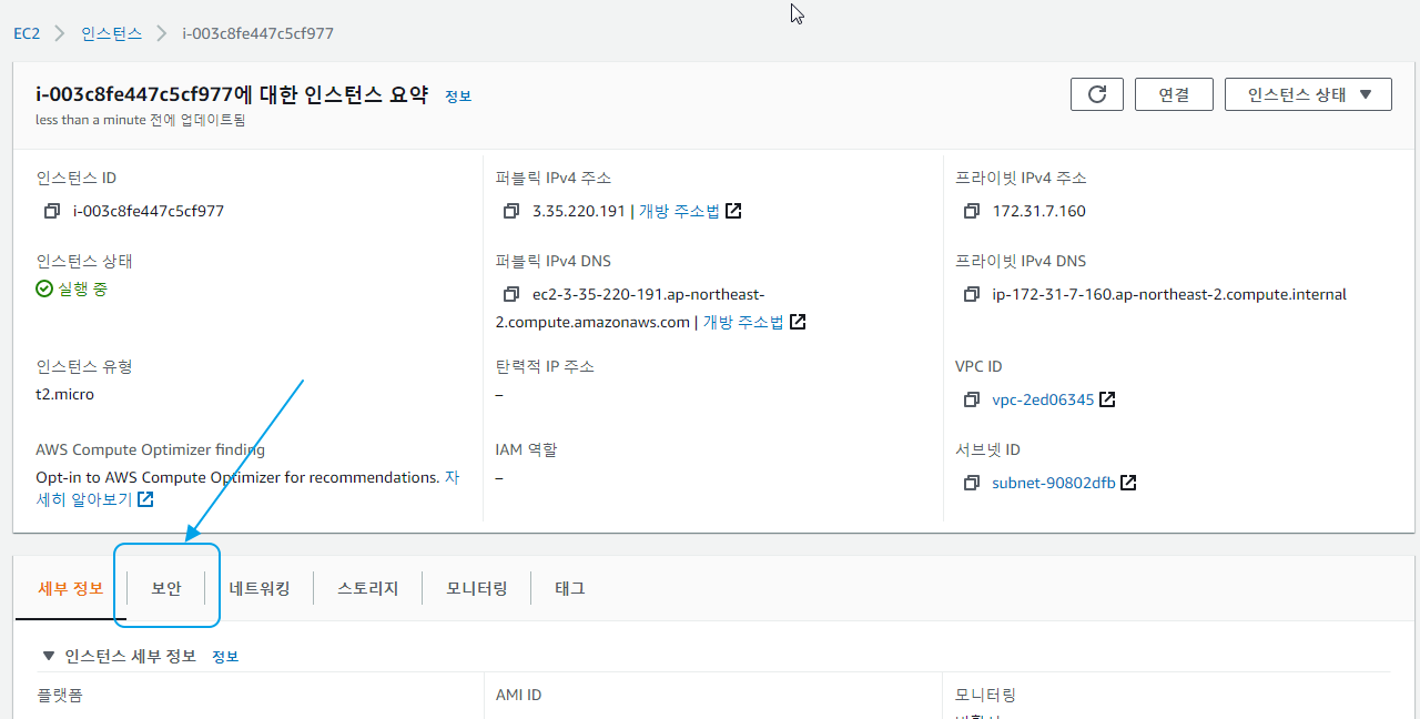 그러면 인스턴스 요약창이 노출될텐데요, 보안 탭에서 서비스 포트를 제어할 수 있습니다.
