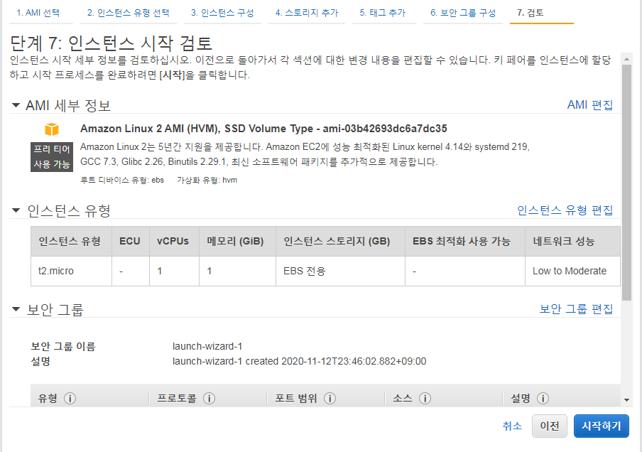 프리 티어 사용 가능 항목이 기본 선택된 상태에서, 검토 및 시작 버튼 클릭!