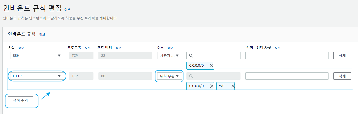규칙 추가 버튼을 누르면 한줄이 늘어납니다. 늘어난 줄에서 유형을 HTTP로, 소스는 위치무관을 선택해 주세요.