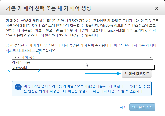 그리고 나서 키 페어 다운로드 버튼을 선택하면,