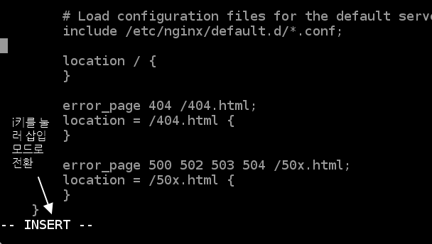 그 아래쪽의 location / { 라고 적힌 바로 윗 줄까지 이동하셔서,