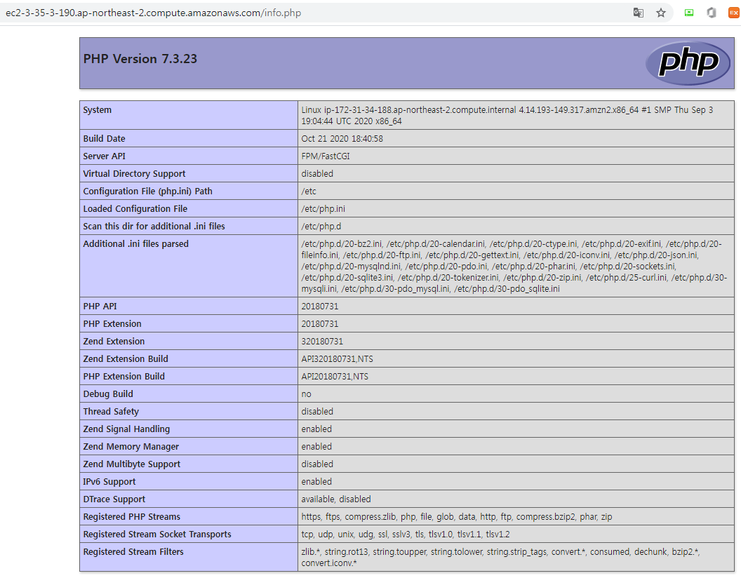 이제 웹 브라우저를 열어 아까 복사했던 퍼블릭 URL + /info.php 를 입력해보시면,
