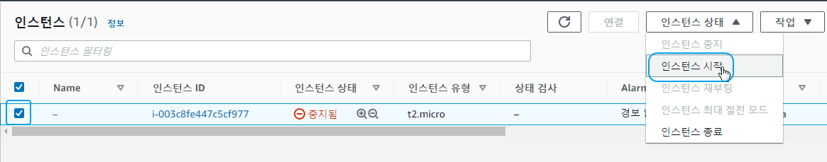 F5 키로 페이지를 새로 고침하여 중지됨이 확인되면 다시 체크를 선택, 인스턴스 시작을 선택해 주세요.