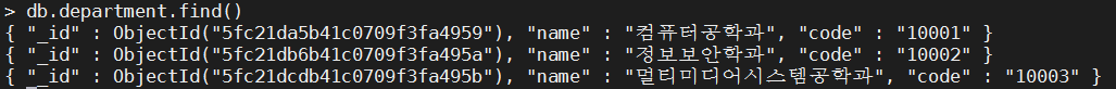 { "_id" : ObjectId("5fc222abb41c0709f3fa495e"), "과명" : "컴퓨터공학과", "코드" : "10001" }