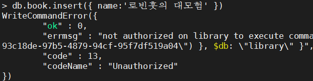 errmsg : not authorized on library to execute command { insert 어쩌고..