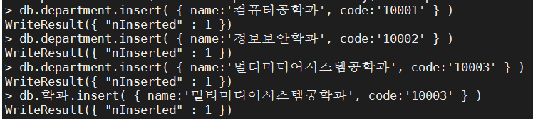 db.department.insert( { name:'정보보안학과', code:'10002' } )