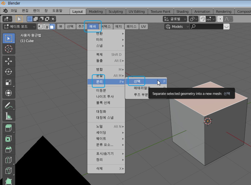 만약 그래도 정히 안 될 경우에는 메쉬 - 분리 - 선택 메뉴를 직접 선택하는 방법도 있는데요.
