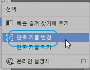 여기에서 선택 메뉴를 마우스 우클릭하면 단축키를 직접 변경할 수 있는 메뉴가 나오는데,