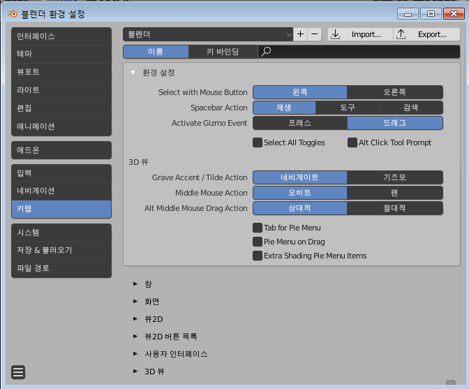 환경설정 창을 다시 열어 키맵 유형 Blender 를 선택하는 것입니다.