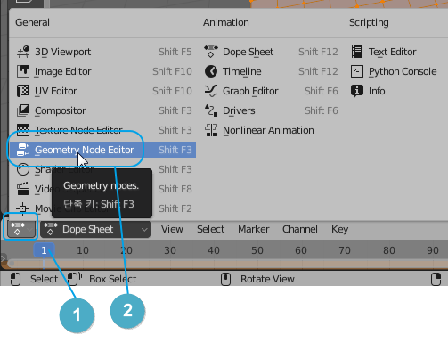 화면 하단의 도프 시트(Dope sheet) 창을 잠깐 지오메트리 노드 에디터로 활용해봅시다.