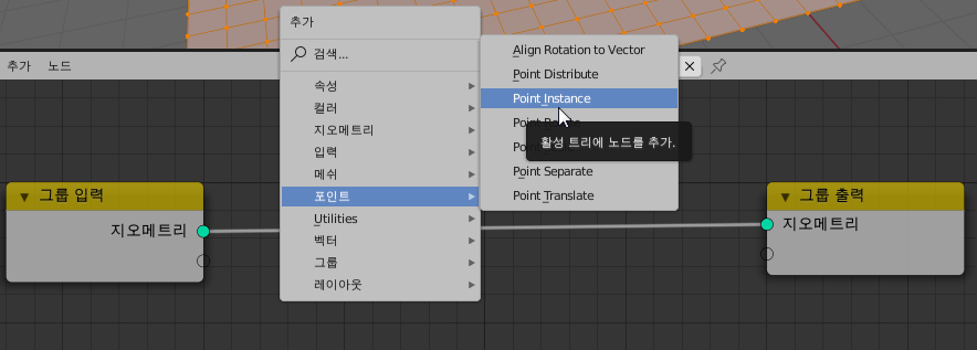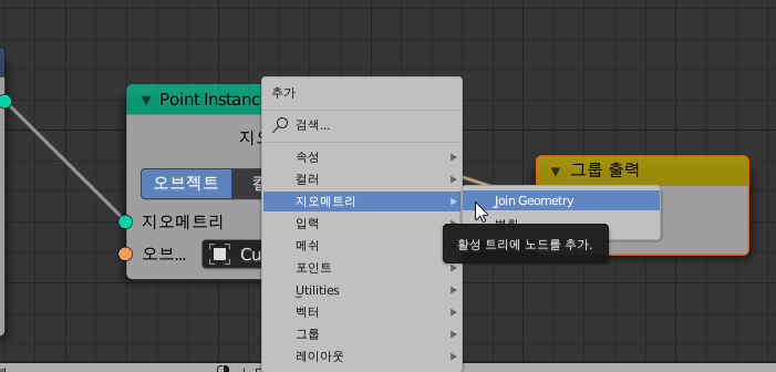 이번에는 지오메트리 노드에디터의 오른쪽 부분에 하나의 노드를 추가해 봅시다.