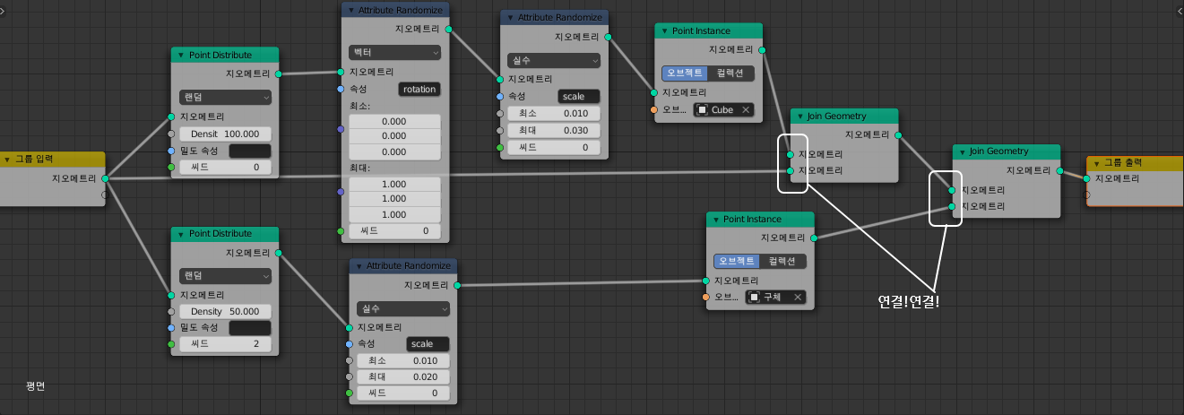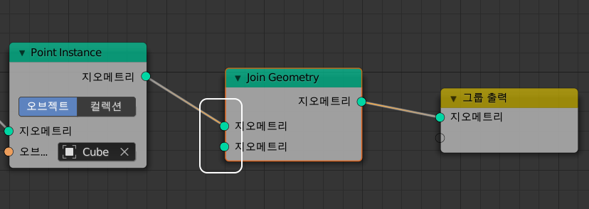 그러면 이와 같이 2개의 지오메트리를 연결할 수 있는 노드가 배치가 됩니다.