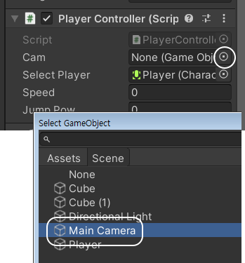 Inspector 창 하단에 Cam 항목이 추가되어 있을 겁니다.