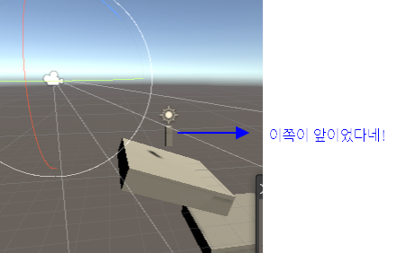 현재 화면에서의 정확한 방향은 Scene 화면 우측의 나침판과 같은 안내 부분을 참조하시면 됩니다.