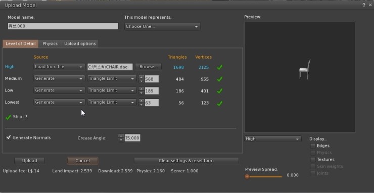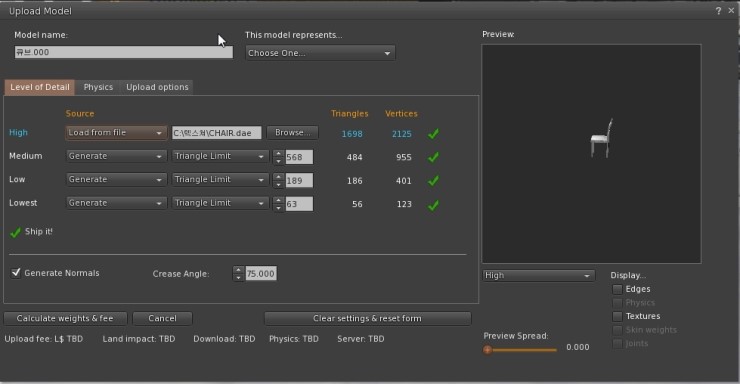 세컨드라이프에서 업로드할 때는, Build - upload - Mesh Model 메뉴에서 업로드하는데,