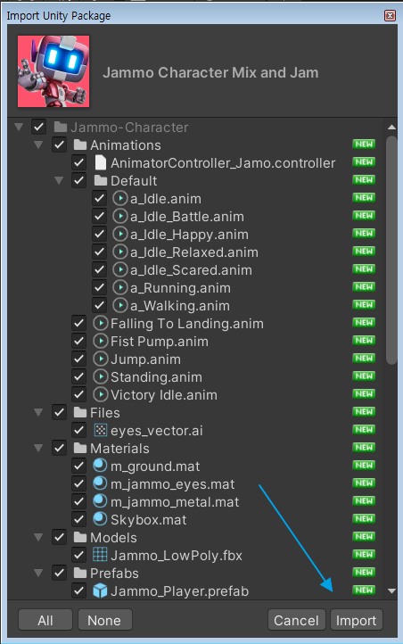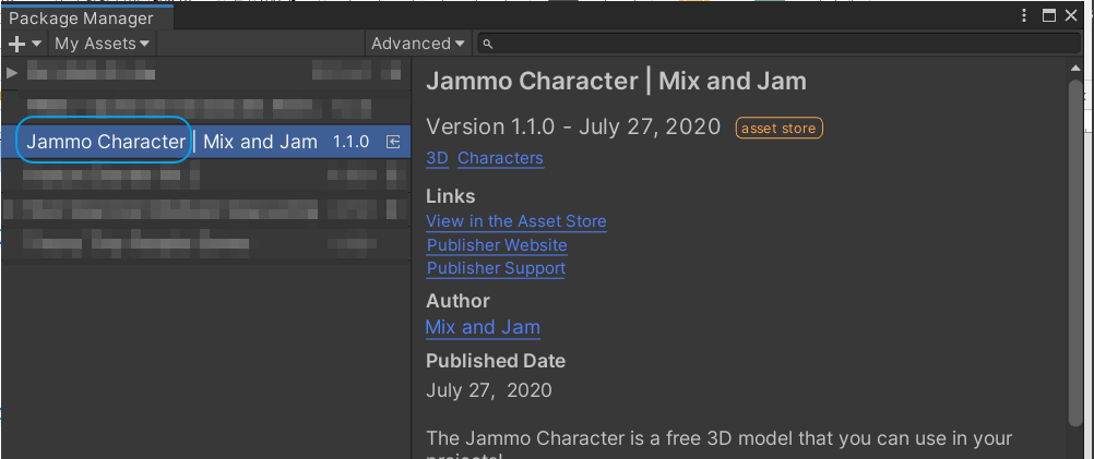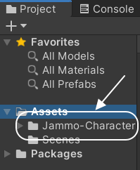 위 과정을 거치고 나면 프로젝트 창의 Assets 폴더 하위에 Jammo-Character 라는 폴더가 생겨난 것을 확인하실 수 있는데요. 이 상태가 내 프로젝트에 에셋을 불러온 상태인 것입니다.