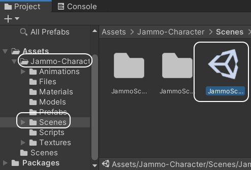 Jammo-Character - Scenes 폴더를 선택 한 후 JammoSc...으로 된 아이콘을 더블클릭해보세요