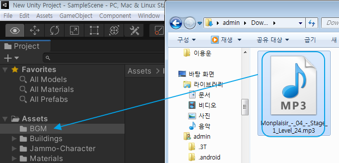 그리고 윈도우 탐색기를 열어 금방 다운받은 배경음악 파일을 프로젝트 창의 Assets/BGM 폴더에 드래그 합니다.