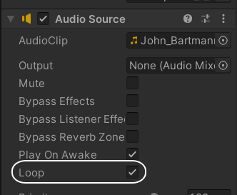 이 것은 인스펙터 창에 오디오 컴포넌트가 있다고 가정할 때 loop 체크상자를 체크한 것과 동일한 효력을 갖습니다.