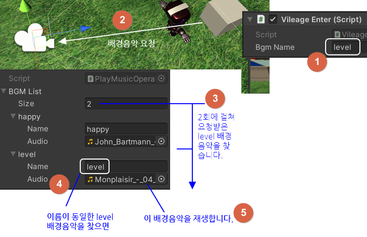 결국 첫번째 배경음악 'happy'를 재생해달라고 PlayBGM() 메소드에게 요청하는 것이지요.