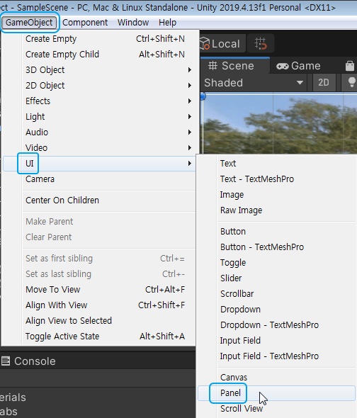 이 패널대화창은 유니티의 기본 배경창인데요.