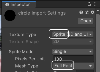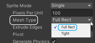 Inspector 창에서 Texture Type은 Sprite, Mesh Type은 Full Rect를 선택해 줍니다.