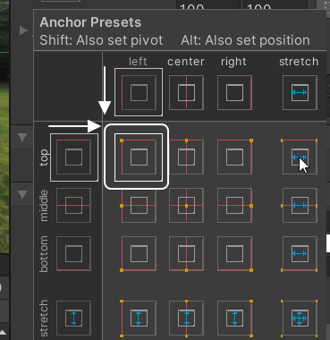 그리고 나서 Panel 기준으로 왼쪽 상단 기준에 붙도록 Rect Transform 을 Left / Top 으로 선택해 주세요.