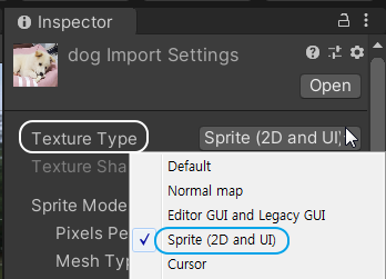 Inspector 창에서 Texture Type(텍스쳐 타입) 의 우측 선택 상자를 선택, Sprite (2D and UI)항목을 선택합니다.