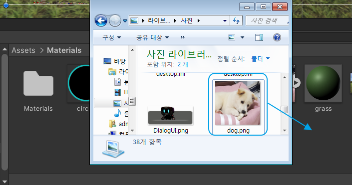 유니티를 실행. Assets > Materials 폴더에 이미지를 드래그해서 넣습니다.