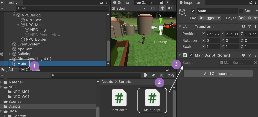 2) MainScript 를 클릭, 마우스 버튼을 놓지 말고