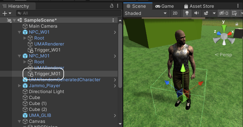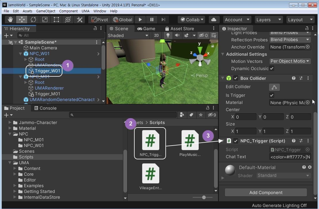 NPC 에게는 콜라이더는 있지만 트리거는 없으므로 트리거를 하나씩 만들어보도록 하지요.