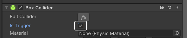 Box Collider(박스 콜라이더) 컴포넌트의 Is Trigger(이즈 트리거) 체크 상자 체크 - 이 것으로 이 물체는 관통할 수 있으며 충돌을 검사할 수 있는 물체가 됩니다.