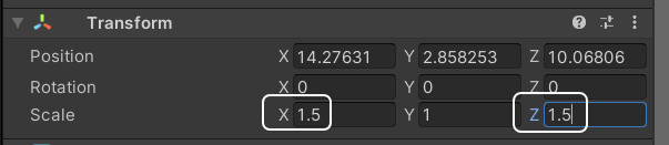 Transform(트랜스폼) 컴포넌트의 Scale : X 1.5, Z 1.5 - 크기를 변경해 줍니다.