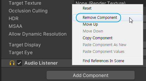 유니티는 기본적으로 하나의 Audio Listener 만 존재해야 하기 때문에