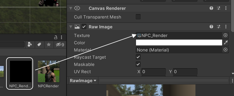 그리고 금방처럼 NPC_Render 텍스쳐를 Raw Image 의 Texture 속성에 드래그합니다.