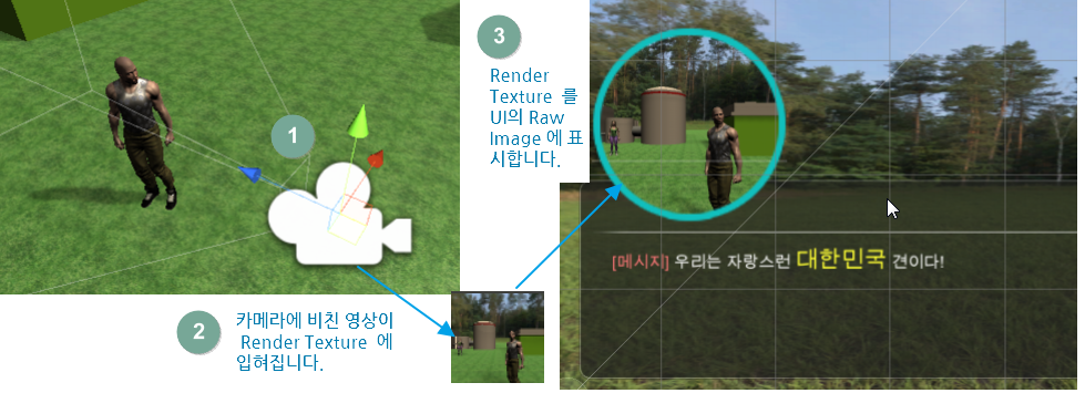 지난 시간에는 Scene(씬)에 카메라를 1대 추가로 세팅하여 캔버스 UI를 통해 월드의 특정 구역을 카메라가 보이는 화면을 띄우는 부분을 살펴보았습니다. 마치 CCTV처럼 말이죠 :) ※ 편의상 쉬운 이