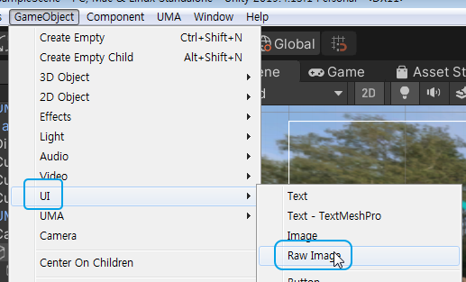 이를 위해 GameObject - UI - Raw Image 를 선택합니다