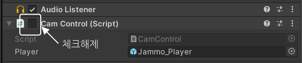 Inspector(인스펙터) 창에서 Cam Control 스크립트 컴포넌트의 체크상자를 해제해 주세요.