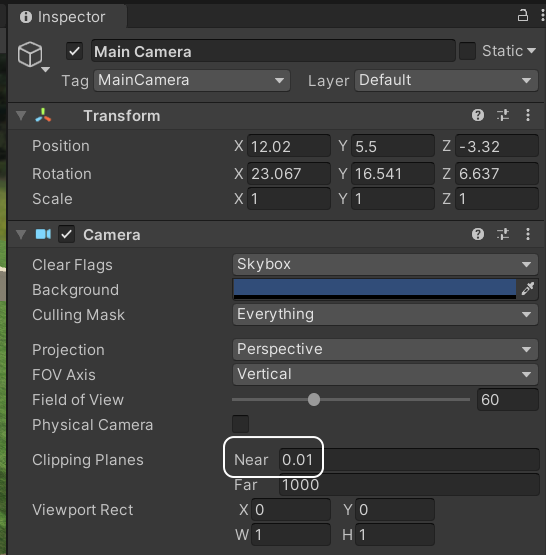 현재 선택된 Main Camera 의 Inspector 창에는 Camera 컴포넌트 내에 Clipping Planes - Near 라는 옵션이 있는데요.
